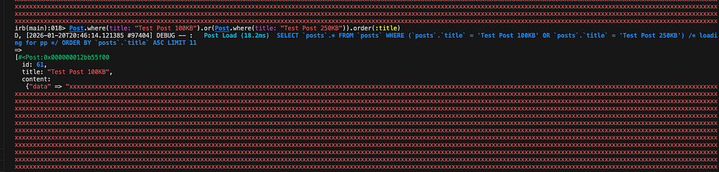 정확한 검증을 위해 Row의 크기를 각각 100KB, 250KB, 300KB로 조정하여 테스트를 진행해보겠습니다. (참고: 단일 Row 조회 시에는 정렬 최적화로 인해 Sort Buffer 이슈가 잘 드러나지 않으므로, OR 조건을 사용하여 복수의 Row를 스캔하도록 유도했습니다.)