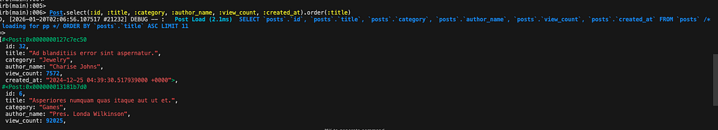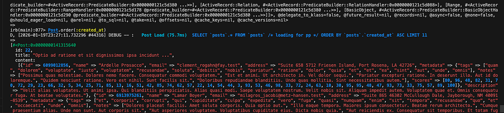 CREATE TABLE posts ( id BIGINT NOT NULL AUTO_INCREMENT PRIMARY KEY, title VARCHAR(255), content JSON, -- 무거운 컬럼 (1MB) category VARCHAR(100), author_name VARCHAR(100), view_count INT DEFAULT 0, created_at DATETIME, INDEX index_posts_on_created_at (created_at) );